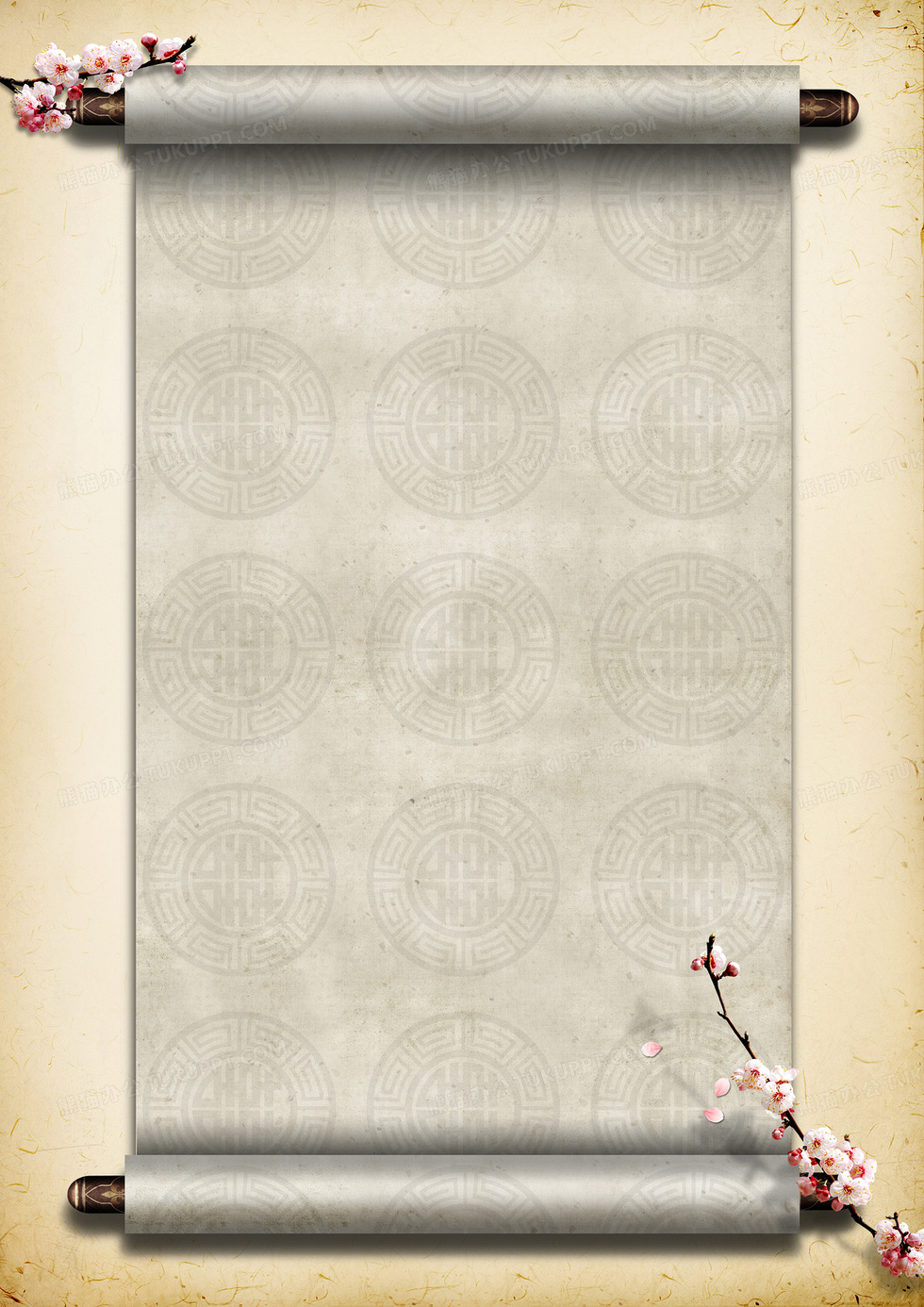 本作品内容为中国风画轴桃花圆形背景素材, 格式为 psd, 图片尺寸为3508 x 4961, 作品中背景图片无需修改, 源文件无水印,可以直接使用, 欢迎使用熊猫办公。 如认为平台内容涉嫌侵权,可通过邮件:tousu@tukuppt.com提出书面通知,我们将及时处理。