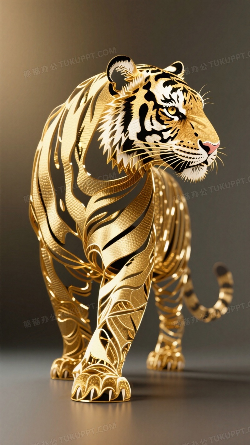 本作品内容为纯色背景用金丝极简抽象绕出一个镂空威猛无比的东北虎形体轮廓, 格式为 jpg, 大小1 MB, 图片尺寸为936 x 1664, 源文件无水印, 欢迎使用熊猫办公。 如认为平台内容涉嫌侵权,可通过邮件:tousu@tukuppt.com提出书面通知,我们将及时处理。