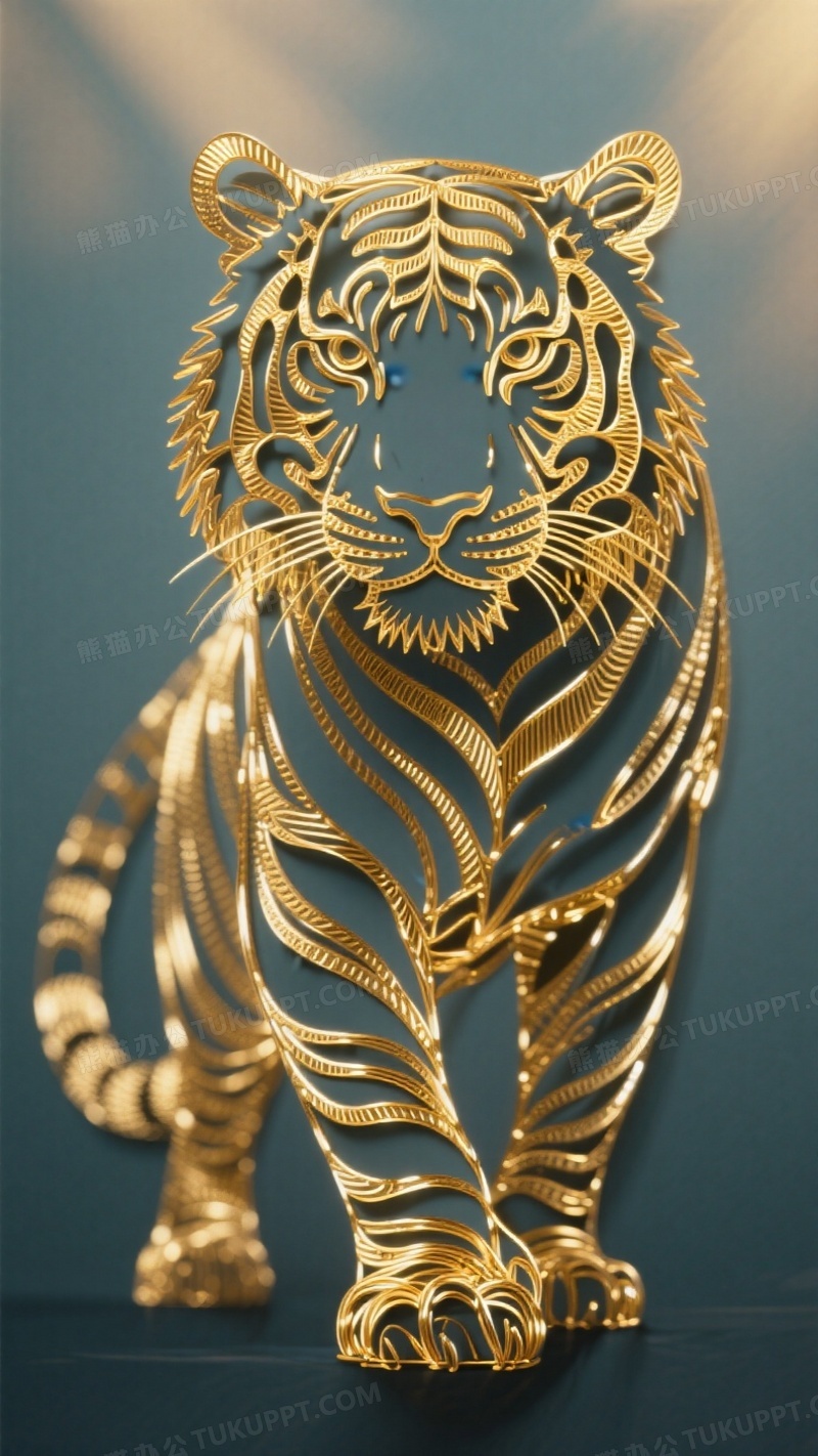 本作品内容为纯色背景用金丝极简抽象绕出一个镂空威猛无比的东北虎形体轮廓, 格式为 jpg, 大小1 MB, 图片尺寸为936 x 1664, 源文件无水印, 欢迎使用熊猫办公。 如认为平台内容涉嫌侵权,可通过邮件:tousu@tukuppt.com提出书面通知,我们将及时处理。